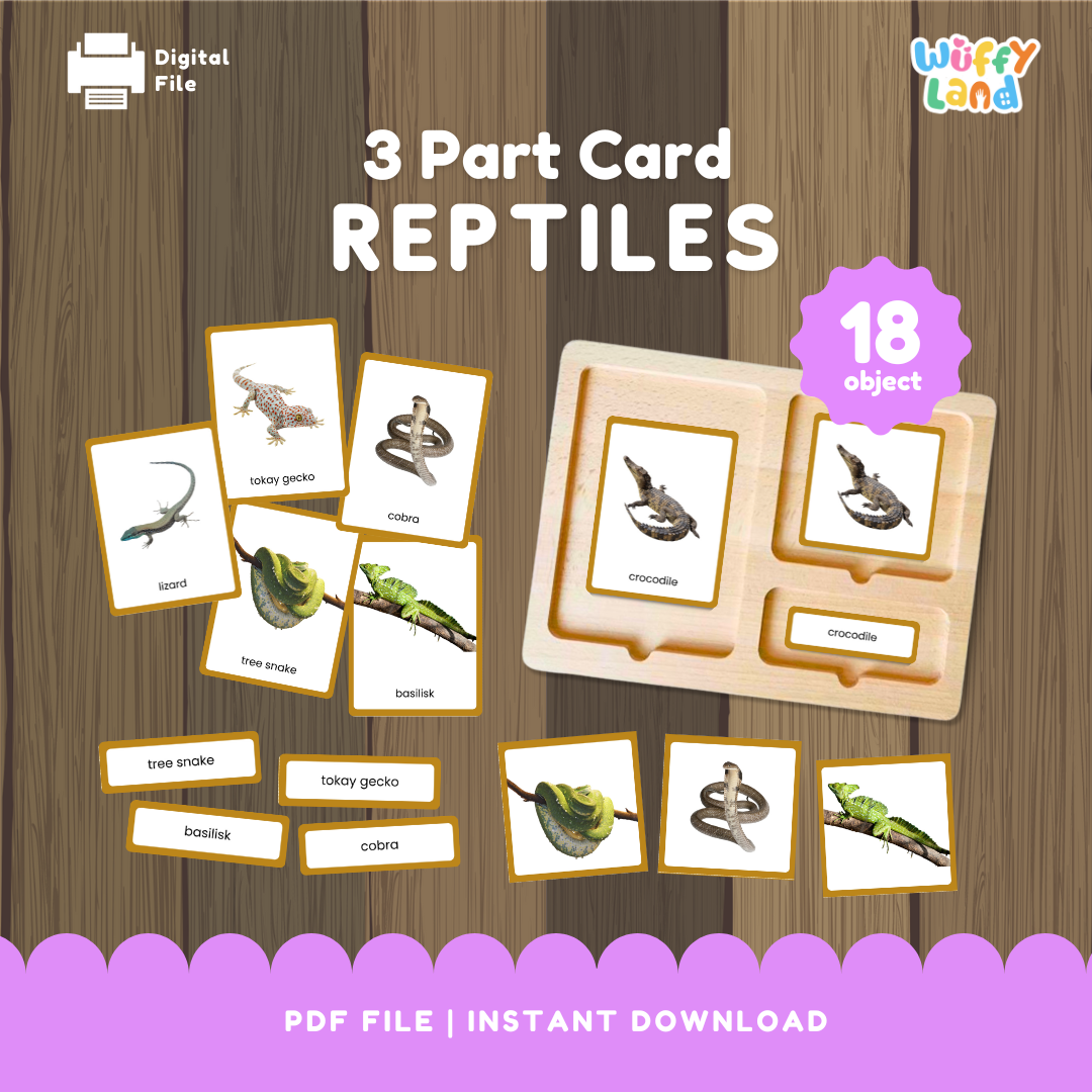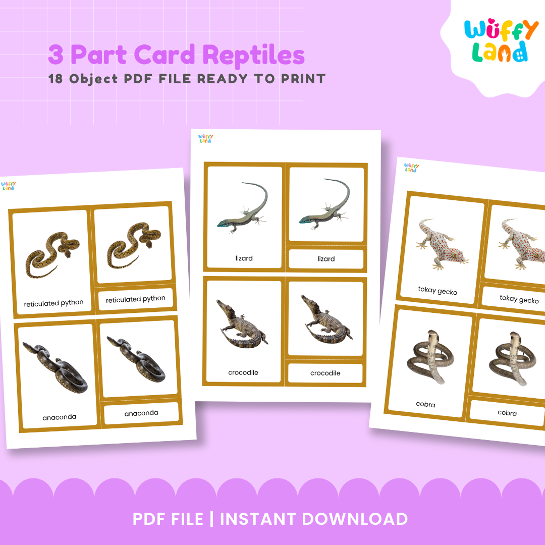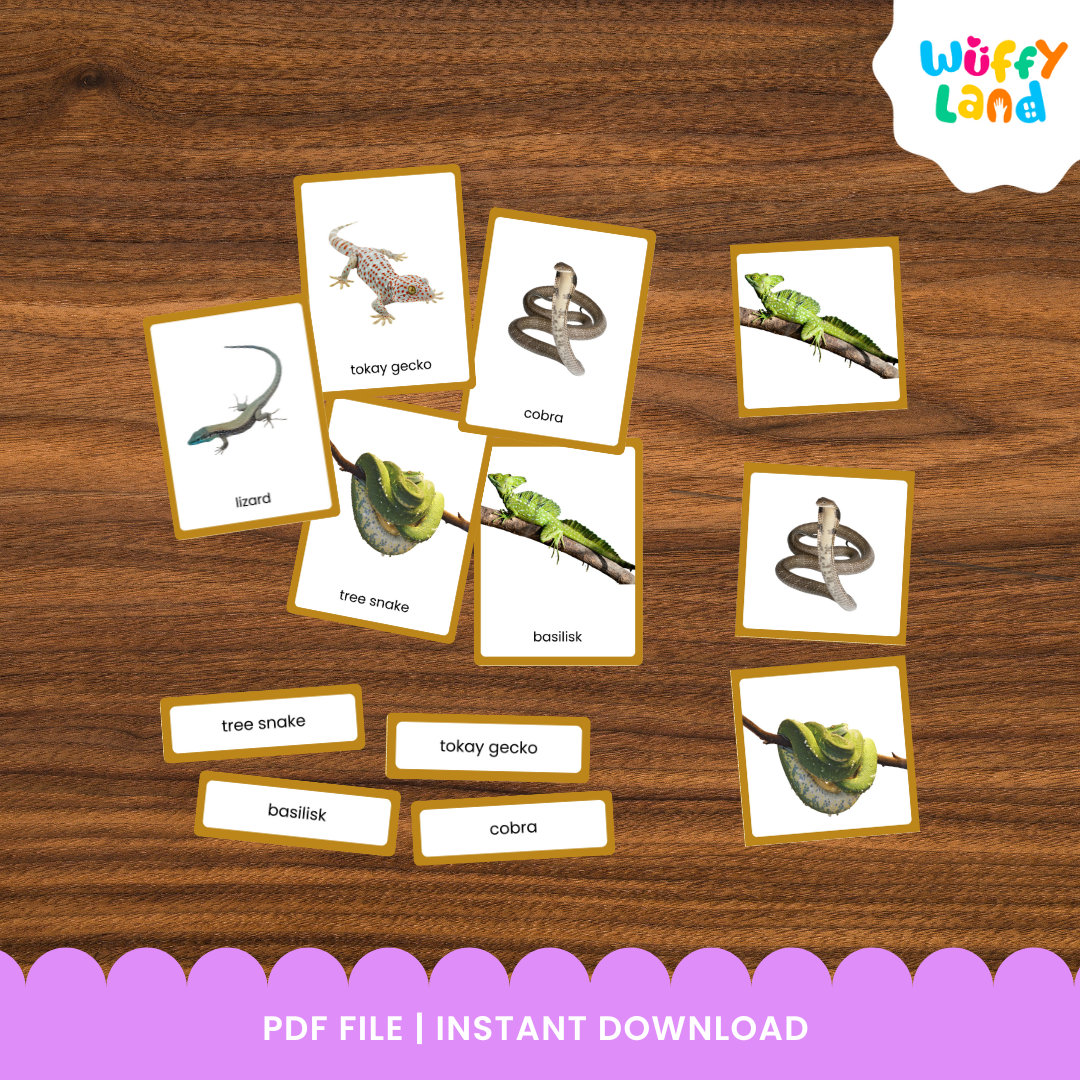 Kartu 3 Bagian Reptil Montessori yang Dapat Dicetak - Aktivitas Identifikasi & Kosakata Hewan