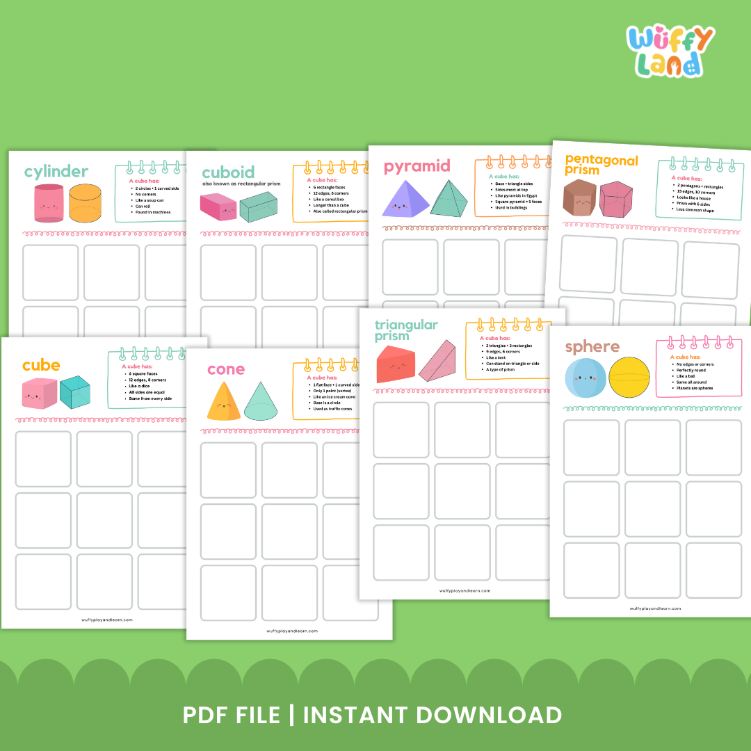 - 10 Alas Sortir yang menampilkan bentuk 3D: bola, kubus, kuboid, kerucut, silinder, piramida, - prisma segitiga, prisma pentagonal, dan banyak lagi