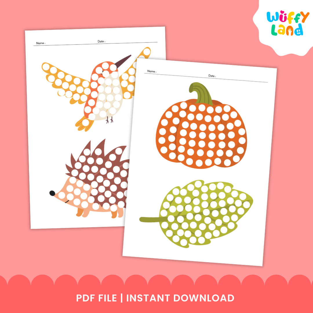 Set ini berisi halaman-halaman spidol titik yang dapat dicetak dengan gambar labu, daun, landak, burung hantu, dan berbagai desain musim gugur lainnya. Cukup ambil spidol bingo, spidol titik, atau cotton bud Anda dan biarkan siswa Anda menikmati aktivitas musiman langsung. Cocok untuk kegiatan di pusat kegiatan, tugas pagi, les seni, atau waktu tenang!