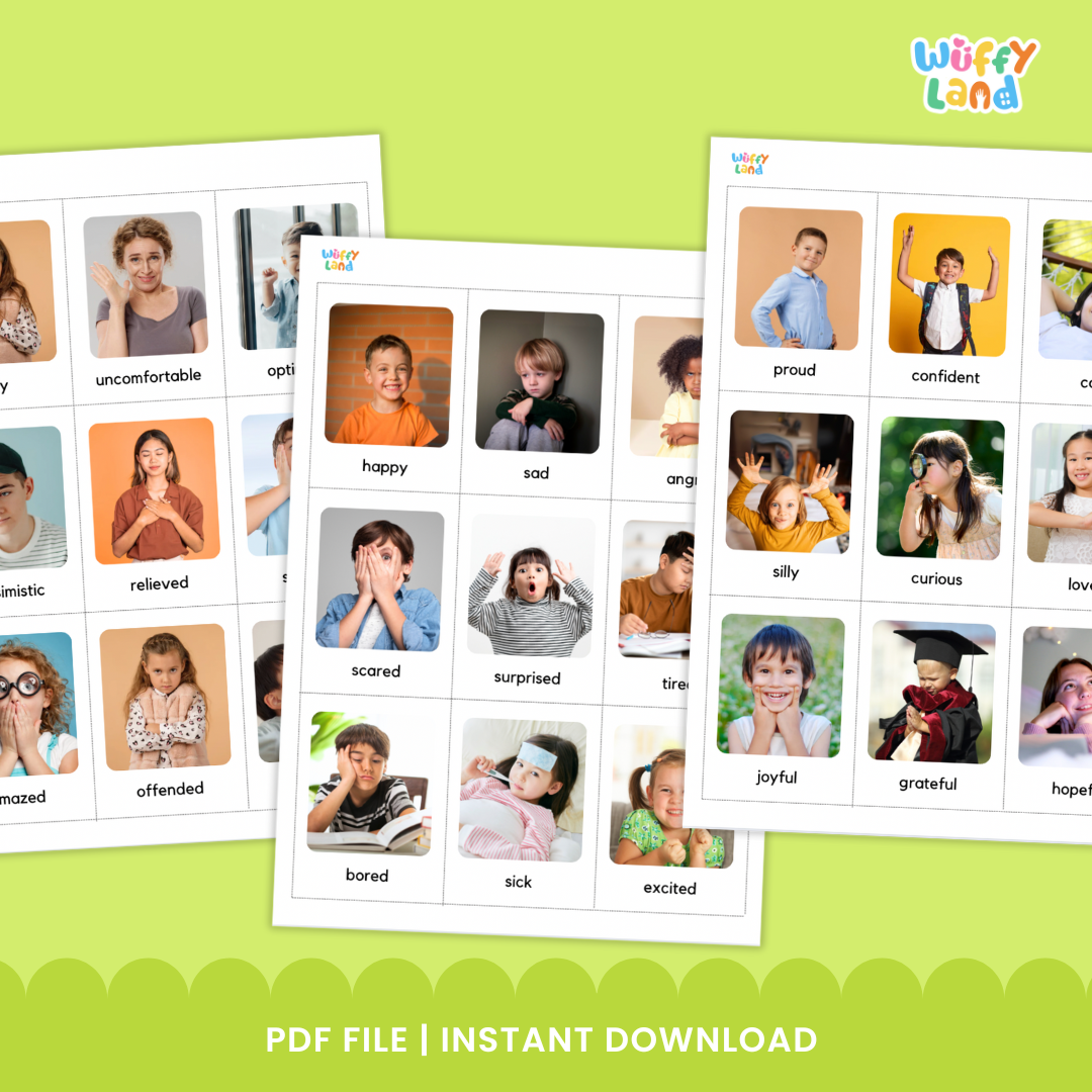 📍 45 kartu emosi berlabel (foto asli anak-anak yang beragam)