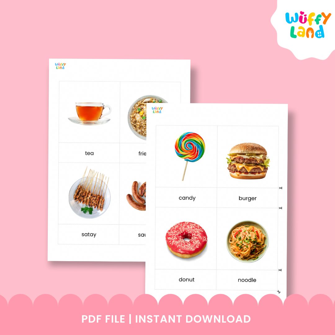 Jadikan pembelajaran kosa kata menyenangkan dan menarik dengan Seri Makanan Kartu Tiga Bagian ini!
