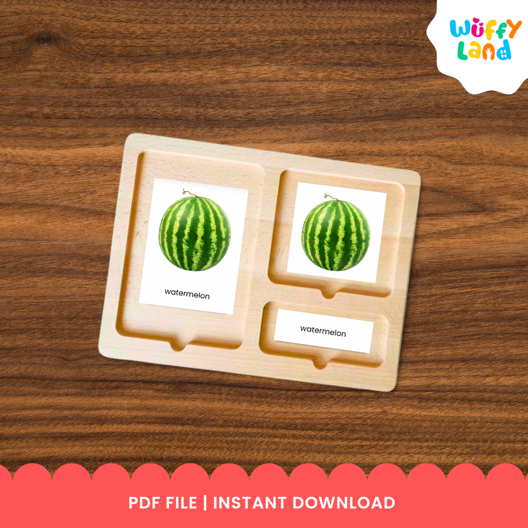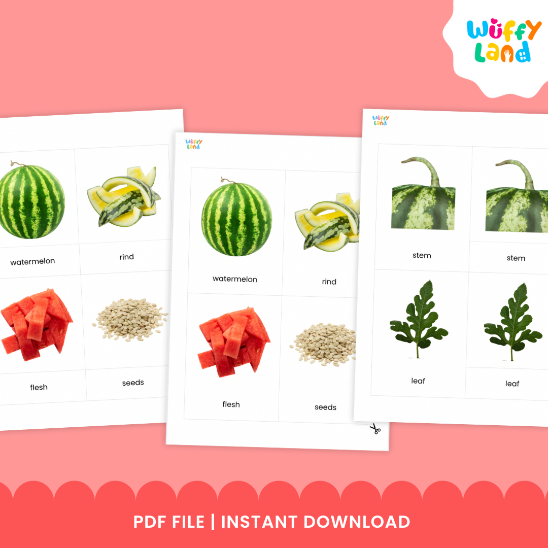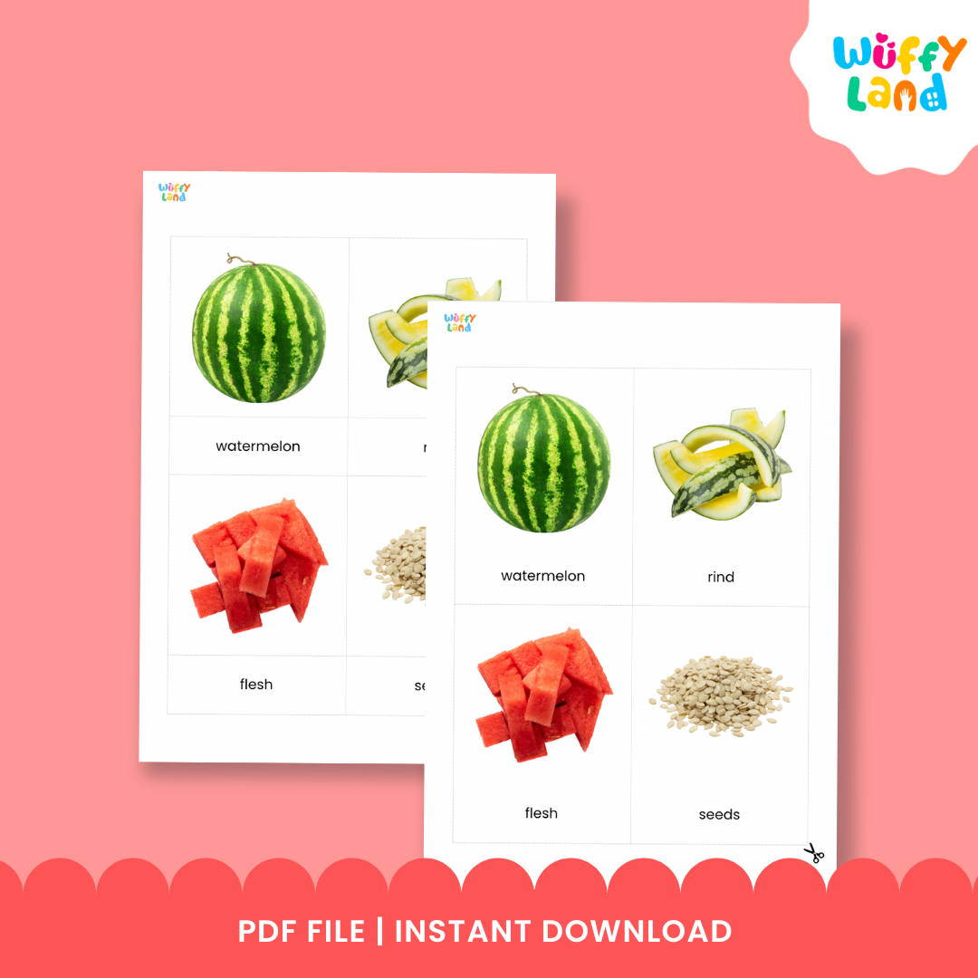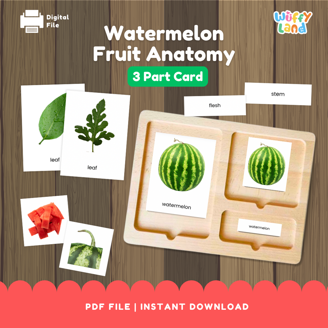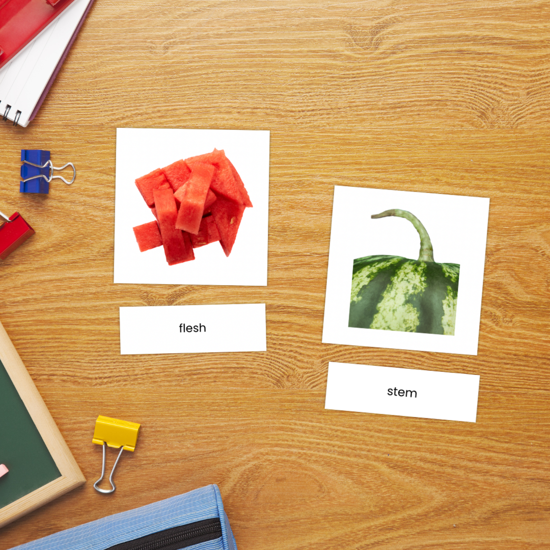Kartu 3 Bagian Montessori Anatomi Buah Semangka untuk Kosakata Sains