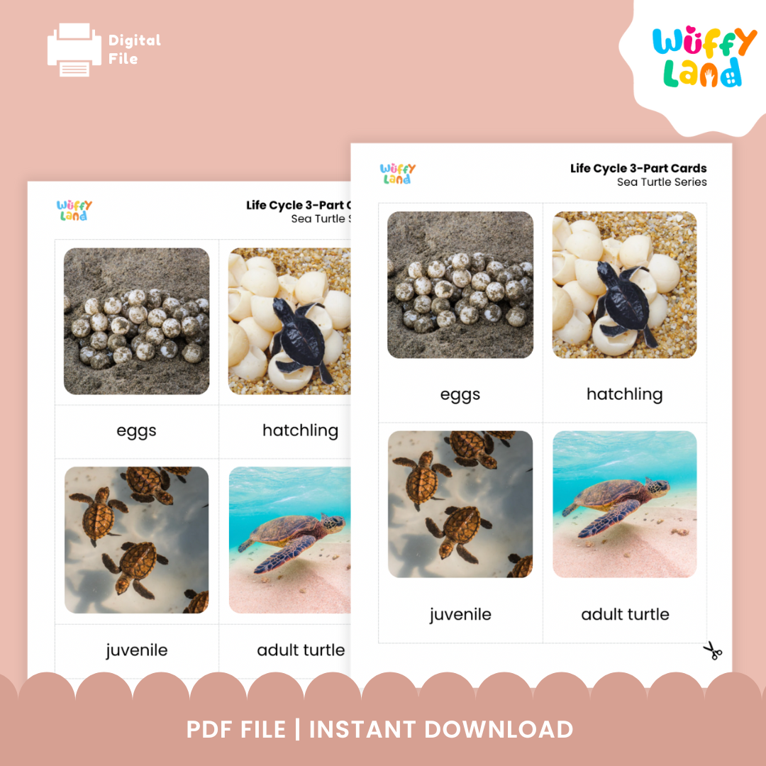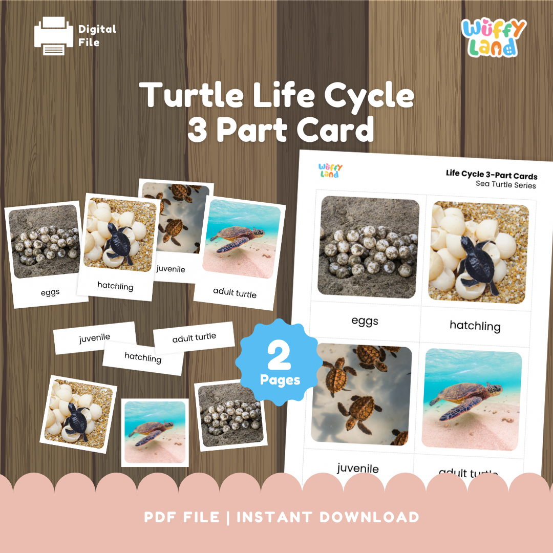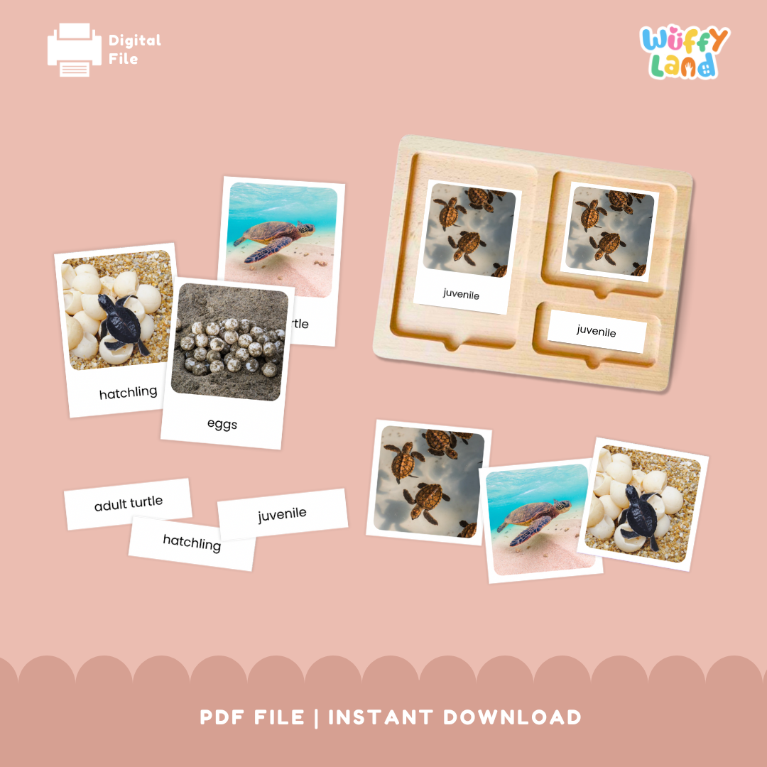 Temukan tahap kehidupan penyu yang menarik dengan ini Kartu 3-Bagian yang terinspirasi Montessori !