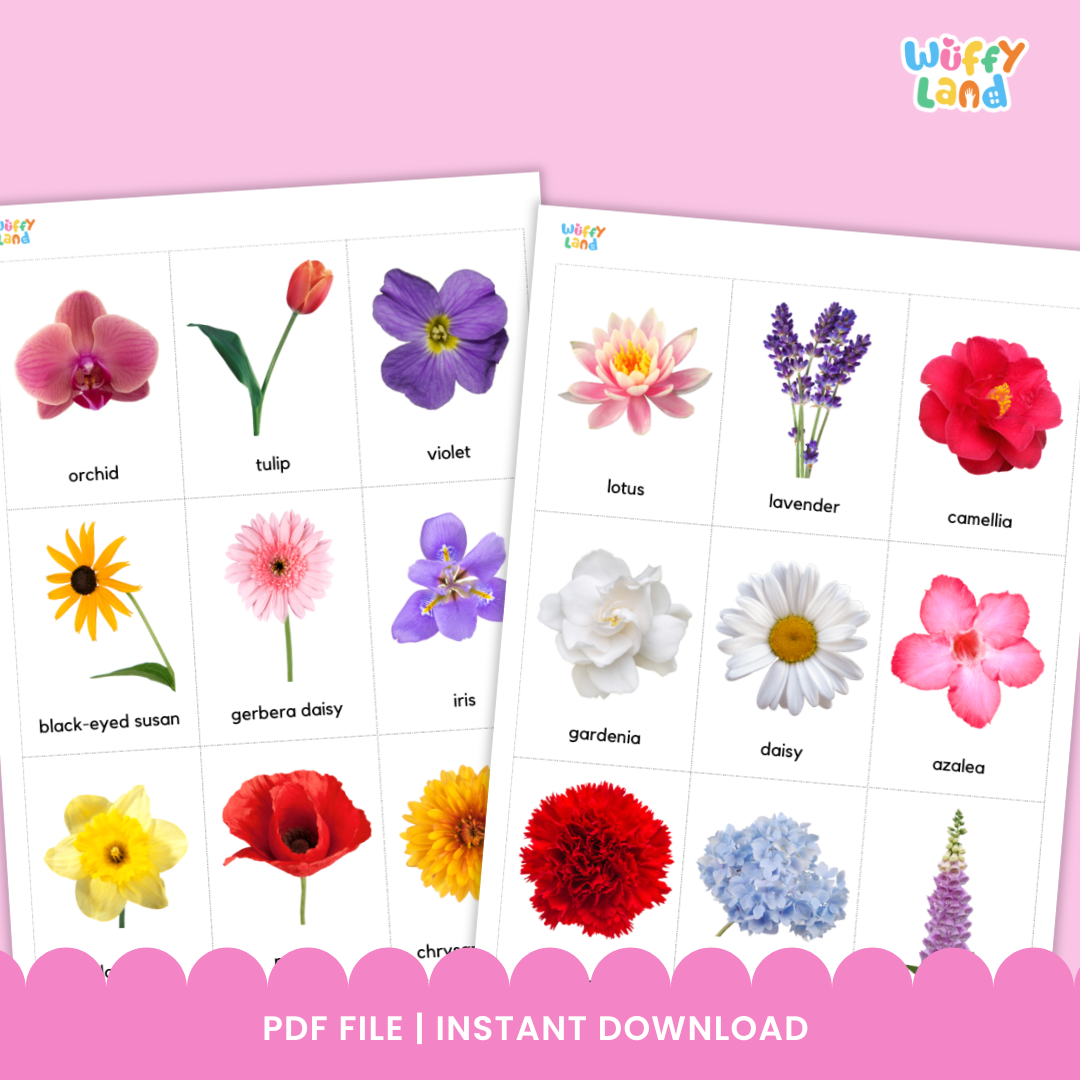 Hidupkan waktu belajar alam dan kosakata Anda dengan satu set 54 kartu flash bunga foto asli yang cantik . Sempurna untuk unit sains, latihan kata, ESL/ELL, rak Montessori, atau tema musim semi/taman!