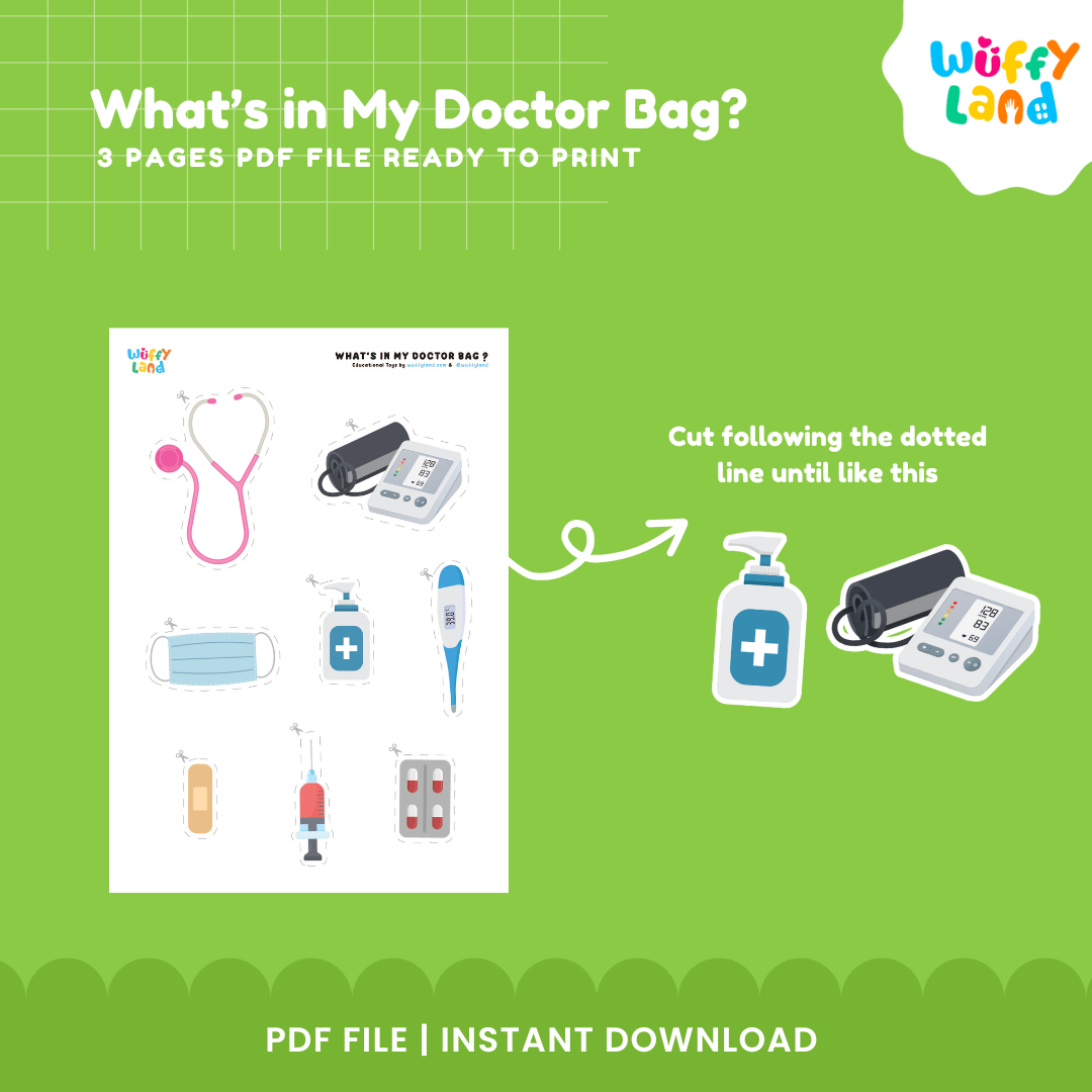 Dengan 3 halaman yang menarik, anak-anak dapat memotong, mencocokkan, dan menyortir barang-barang yang biasanya ada di tas dokter. Ini cara yang menyenangkan untuk meningkatkan keterampilan motorik halus, pengembangan kosakata, dan permainan imajinatif! βοΈπ§ π