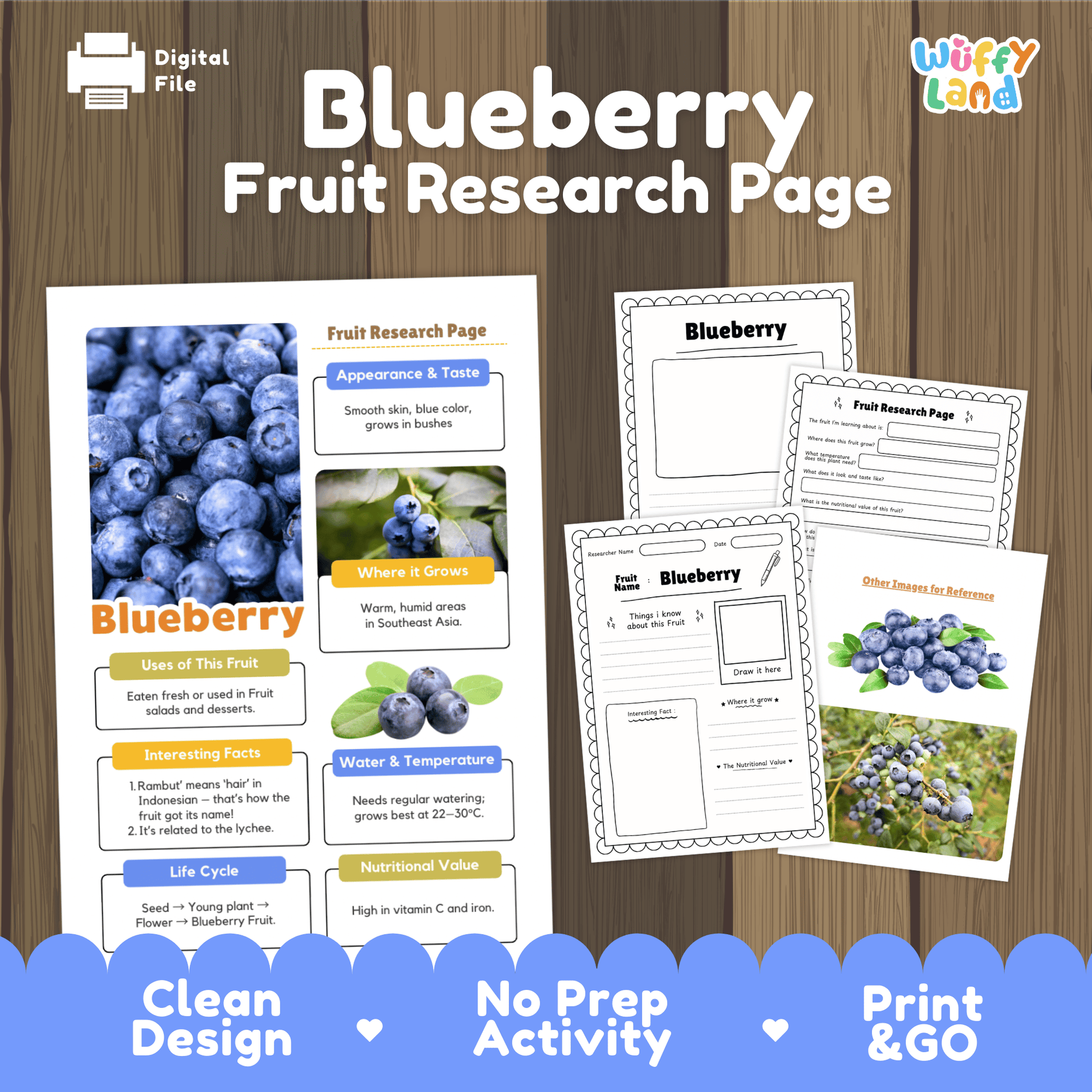 This is a Bundle Deal that features both a colorful "All About Blueberries" reference sheet and a set of black-and-white student research worksheets. It is a perfect "Print & Go" resource for science centers, school garden projects, or units on fruits and superfoods.