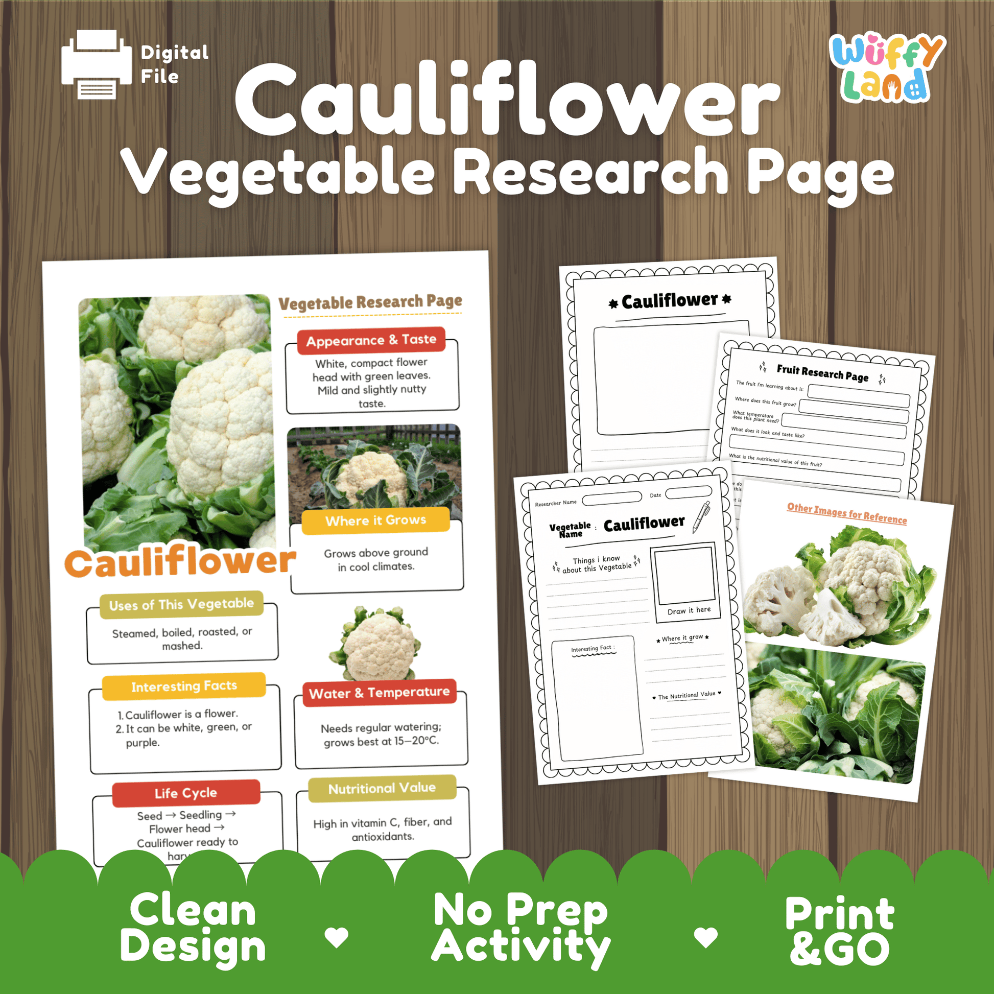 - Vegetable Research One-Pager: A clear, colorful information sheet covering Cauliflower's Appearance (White compact flower head), Habitat (Cool climates), Uses (Steamed, roasted, mashed), Life Cycle (Seed to Harvest), and Nutritional Value (High in Vitamin C!).